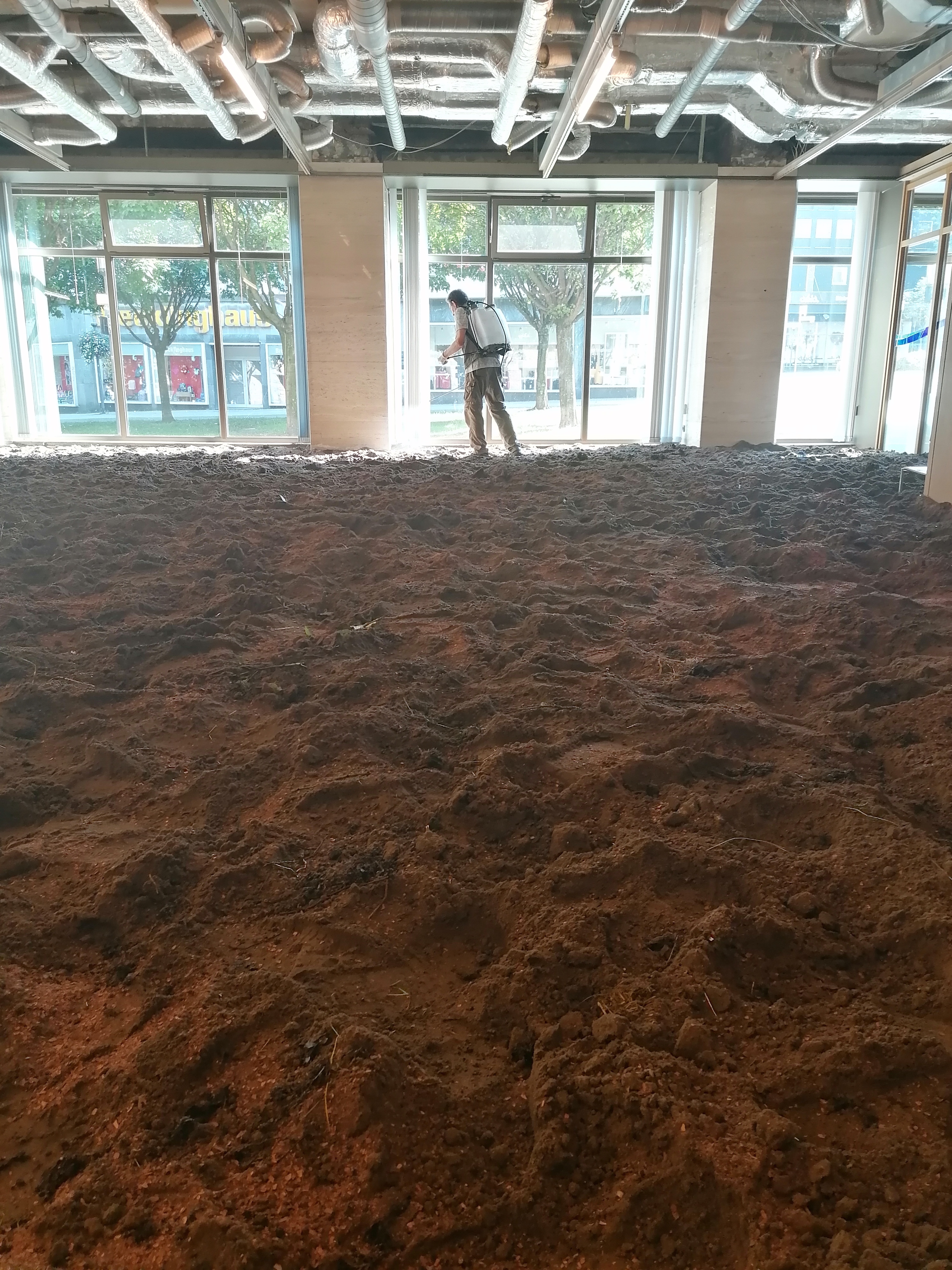 Asad Raza wollte, dass wir alle Passant:innen ansprechen, auf die Ausstellung aufmerksam machen, sie herein bitten. Zunächst haben wir das versucht, doch nach einigen Schichten war uns allen klar, dass dieser Versuch nur selten zum Erfolg führt. Lohnend war es, die Menschen anzusprechen, die Interesse signalisierten, in die Fenster schauten, aktiv fragten, was wir da machen. Vor der Tür entstanden Gespräche unter uns Vermittlerinnen, aber auch mit den Kultivator:innen. Wir fragten uns, was eine Begegnung mit einem Kunstwerk wie “Absorption”ermöglicht? Zunächst mussten die Besucher:innen etwas Zeit und Ruhe mitbringen; Menschen, die gehetzt auf ihr Handy schauten oder mit Taschen beladen die Innenstadt verließen, waren meist nicht offen für einen Besuch. Es musste ein Zugang zum sinnlichen Erleben da sein, dieser hängt manchmal einfach von Tag oder Uhrzeit oder Lebensphase ab. Ich gehe davon aus, dass jeder Mensch Kunst erleben und etwas aus ihr ziehen kann. Viele Menschen glauben, dass es bei Kunst etwas zu verstehen gibt und vertrauen ihren Sinnen und ihren eigenen Fragen an ein Werk nicht. Viele Leute lehnten nach kurzer Erläuterung dankend ab und gingen nicht hinein: “Und da ist nur Erde?”; “Wird da was angepflanzt?”; “Der [Künstler] will da nur Erde machen? Warum? Ist der Gott?” Das Verständnis dafür, dass die Herstellung von Erde und ihre Ausstellung Kunst ist, fehlte vielen Menschen. Der performative Akt des gemeinsamen Kultivierens erschloß sich nicht immer.